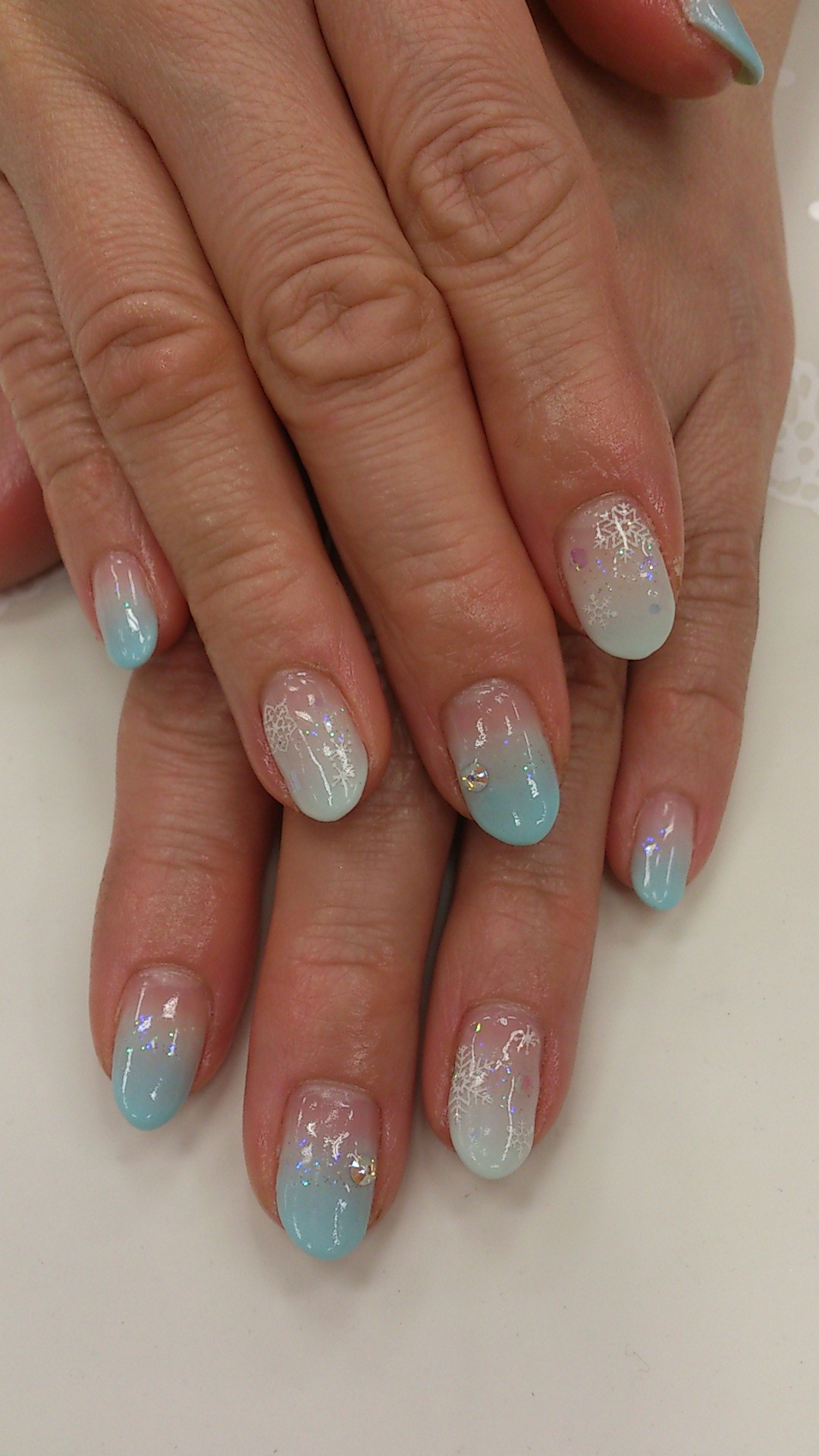 ブルーのカラーグラデーションに、ホワイトの雪の結晶です。